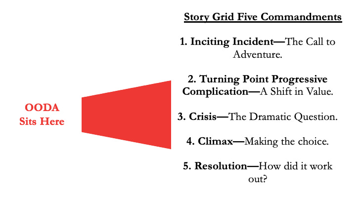 OODA is in Story Grid: Conversely, in a story, each character employs their own OODA map to make sense of their struggles within the world. As they navigate and make sense of that environment (which most critically occurs at the turning point and crisis of the five commandments), the characters employ OODA to come to terms with the situation they are faced with and enact their agency. The characters in stories must process the events, conversations, and circumstances within them, to make the right (if prescriptive tales ) or wrong (if cautionary ones) choices. These choices reveal their character, and teach the lessons of the story. Within the mind of the story characters, their use of OODA mental maps makes the difference in whether they achieve their objectives or fall short.