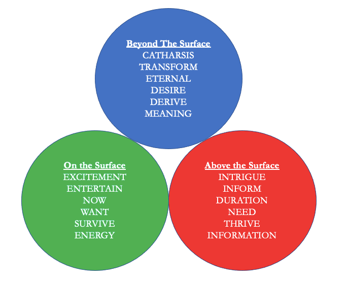 Coyne has a concept known as the “Planes of Perception,” which illustrates the multiple dimensions upon which story operates. On the Surface concerns literal energetic actions “on the page,” so speak (How to Survive), Above the Surface relates to information processing models of reality (How to Thrive), while Beyond the Surface relates to the search for timeless patterns of meaning in the human condition (How to Derive). These planes assist the writer in crafting a story that can stand the test of changing time and place through the skillful integration of elements on each plane.