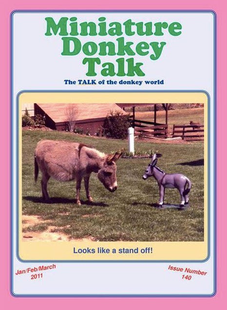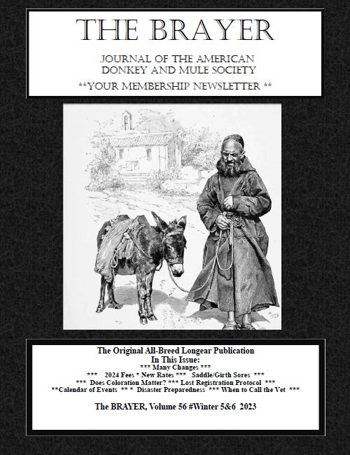 After spitballing a few ideas, I came up with this letter to the editor bit. As a person into my own set of nerdy/niche hobbies, I mean no disrespect to the Donkey/Ass/Burro community. I should note, both of the magazines I mention in this story are REAL. Thanks to all the folks who read early drafts and gave feedback.