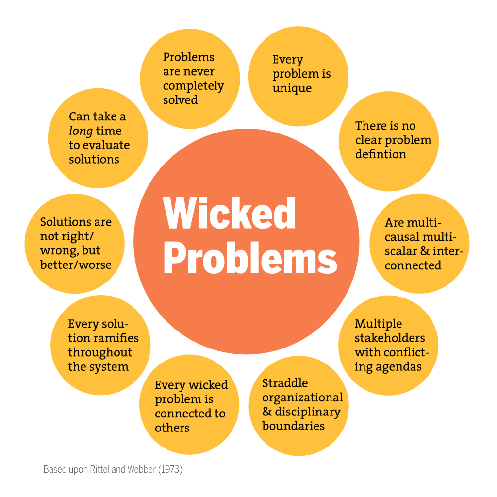 The term is meant to contrast such challenges with “tame” ones that can be addressed with more conventional methods.2 Other attributes of wicked problems include tangled causality, stakeholder conflict, irreducible uncertainty, and interventions that change the problem itself. Since the late 90’s, scholars in public policy, design thinking, and complexity science have extended the concept to include climate change, health systems, urban planning, and information disorder. Basically, lots of the metacrisis/polycrisis topics of concern.